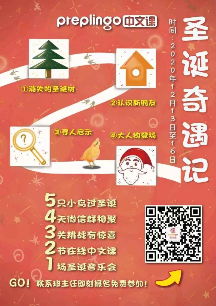 圣诞奇遇记 Posted bypreplingoDecember 11, 2020Posted inBlogs 宝妈们今年终于可以解放双手尽情准备圣诞大餐了~ 来独一无二的线上中文角,学中文+玩游戏,和世界各地小朋友一起互动,好玩又省力,现在扫码免费报名! Share this: Share on X (Opens in new window) X Share on Facebook (Opens in new window) Facebook Like Loading... Related