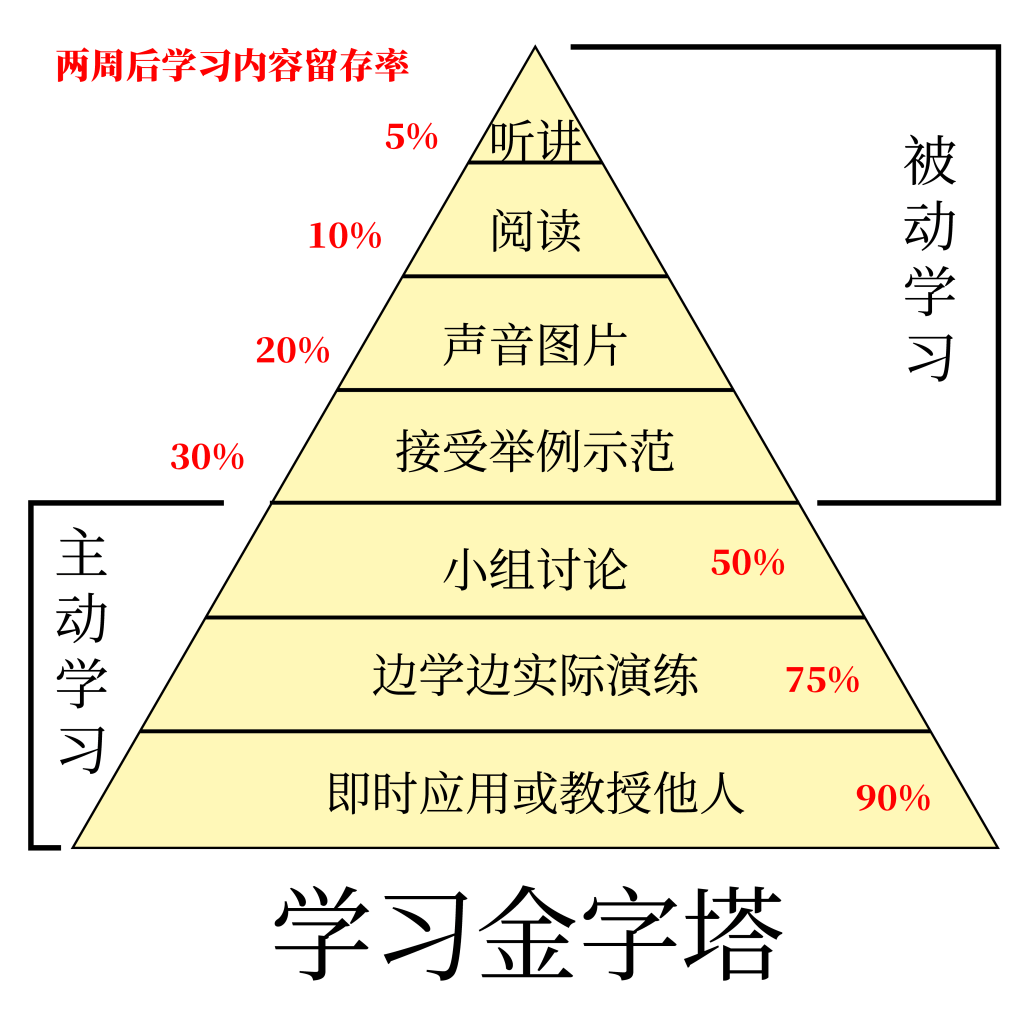 从塔尖到基地,有听讲、阅读、声音图片、接受举例示范、小组讨论、边学边实际演练、即时应用或教授他人等七种学习方式,两周后学习内容的平均留存率为5%、10%、20%、30%、50%、75%及90%。